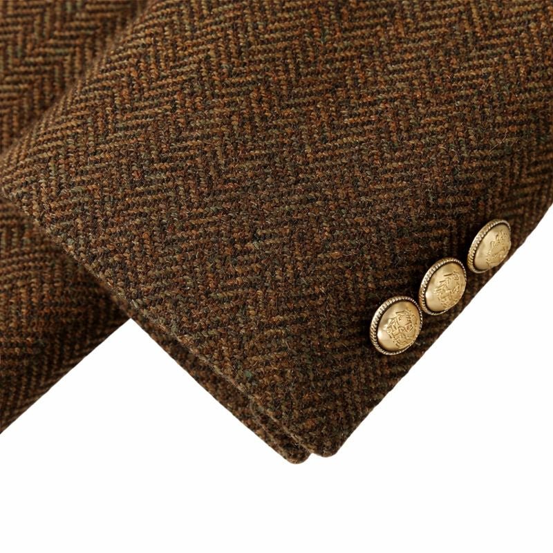 Marynarka dwurzędowa o średniej długości, subtelnie taliowana, z klasycznymi szerokimi klapami typu marynarkowego. Rękawy o długości trzy czwarte, ozdobione złotymi guzikami oraz cienkim paskiem z klamrą.