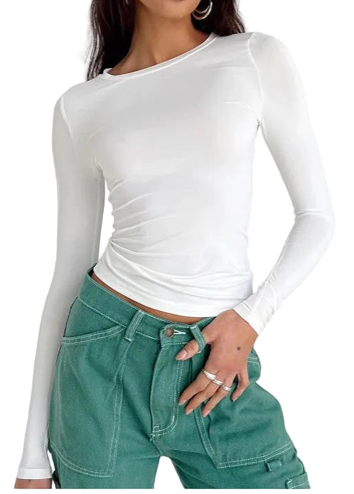 Bluzka z długim rękawem. Ta bluzka z długim rękawem i okrągłym dekoltem, wykonana z jednolitego materiału, to klasyczny element garderoby, który będzie doskonałym uzupełnieniem Twojej garderoby.