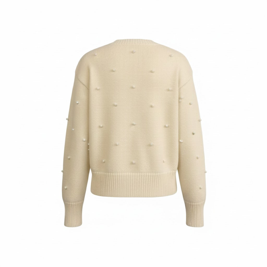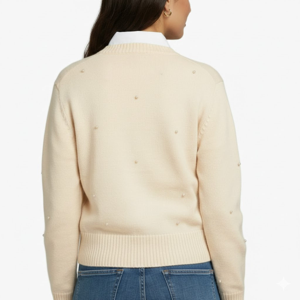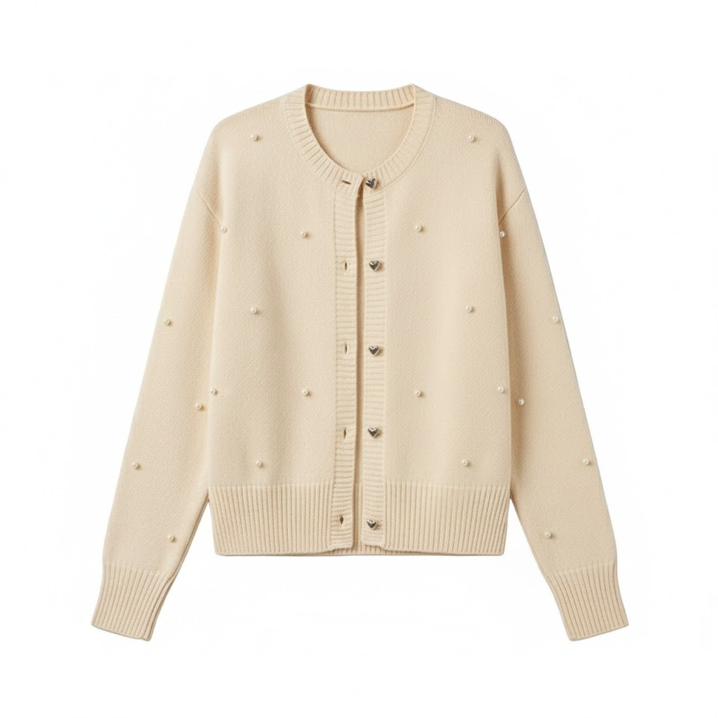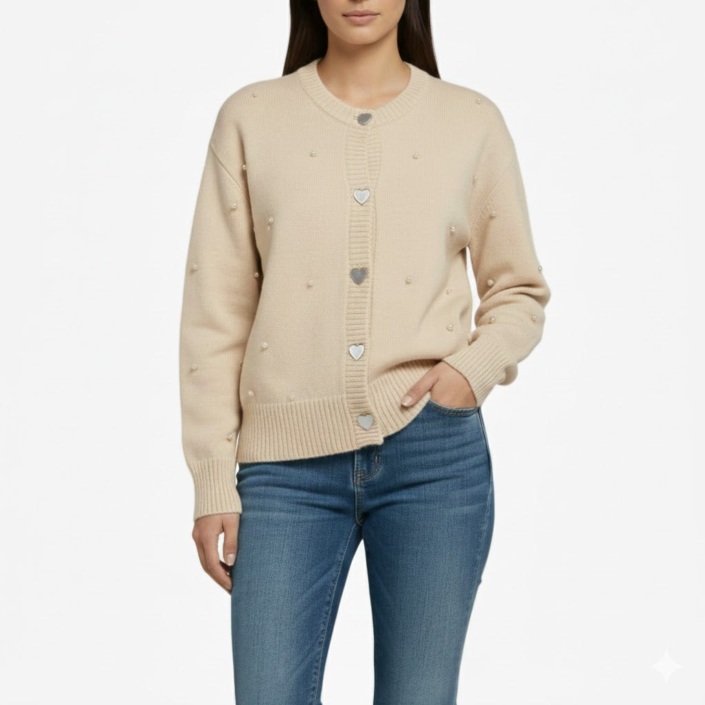 Ta elegancka kamizelka ma klasyczny wygląd dzięki delikatnemu kremowemu kolorowi i subtelnemu wykończeniu perłami. Guziki w kształcie serca dodają figlarności i romantyzmu temu ponadczasowemu elementowi garderoby.