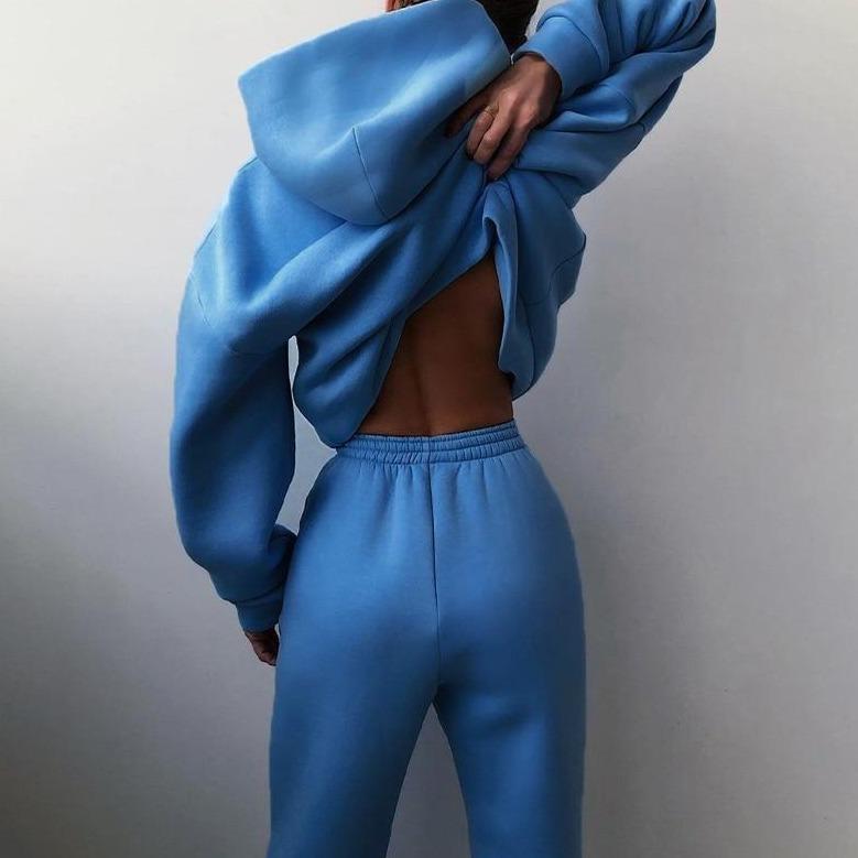 Komplet dresowy damskiv składa się z nierozpinanej bluzy z kapturem oraz spodni. Bluza wyposażona jest w kieszenie, a spodnie mają ściągacze w pasie oraz u dołu nogawek.