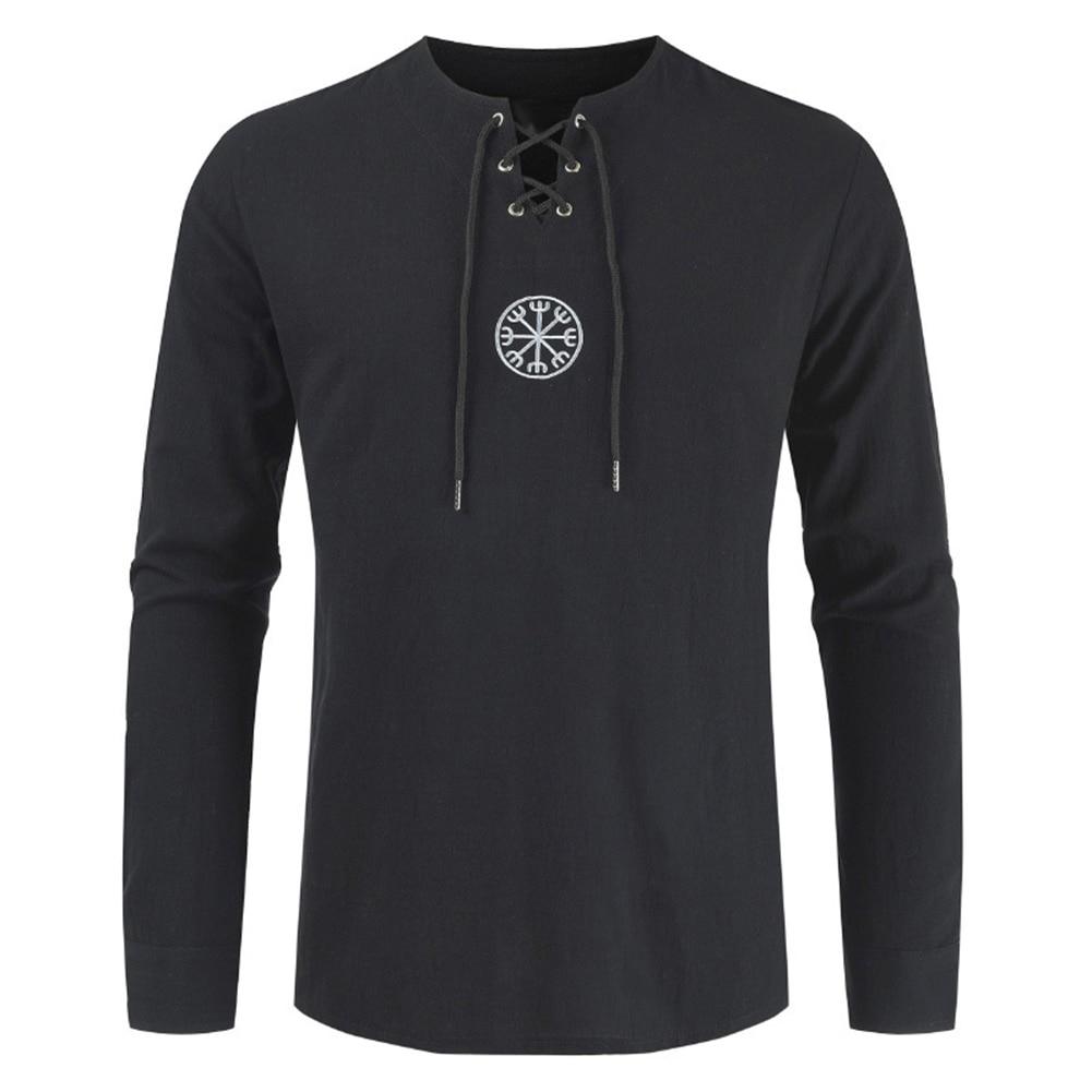 Koszulka męska z długim rękawem w stylu vintage Koszulka męska z długim rękawem posiada dekolt w kształcie litery V oraz sznurowane rozcięcie przy dekolcie. Na powierzchni znajduje się ozdobny nadruk. Produkt dostępny jest w kilku kolorach.