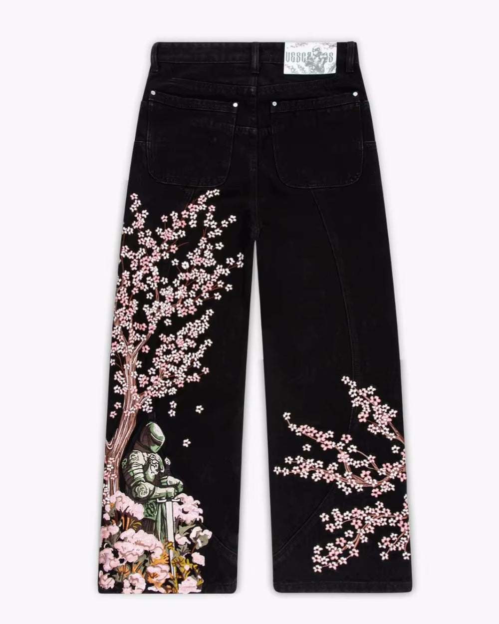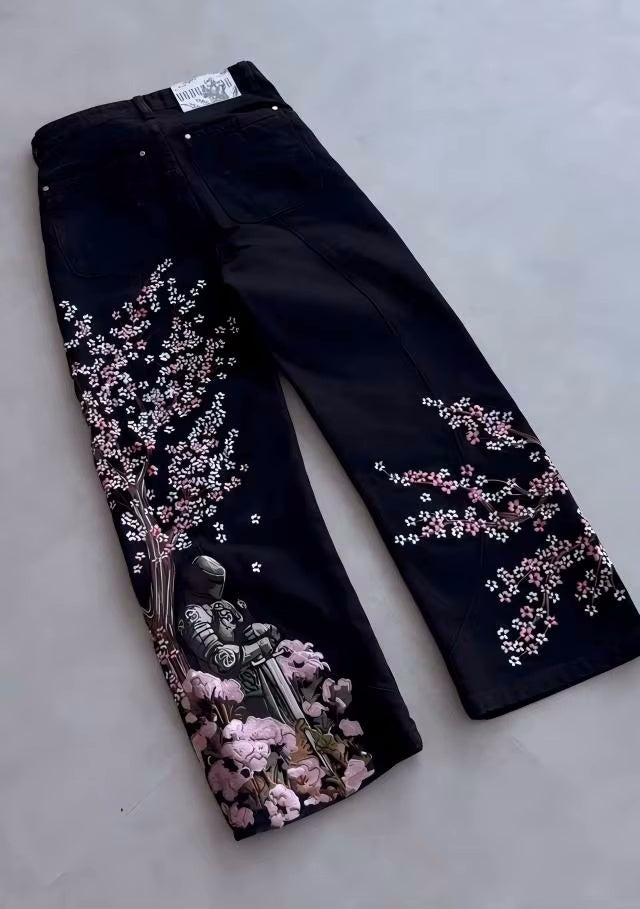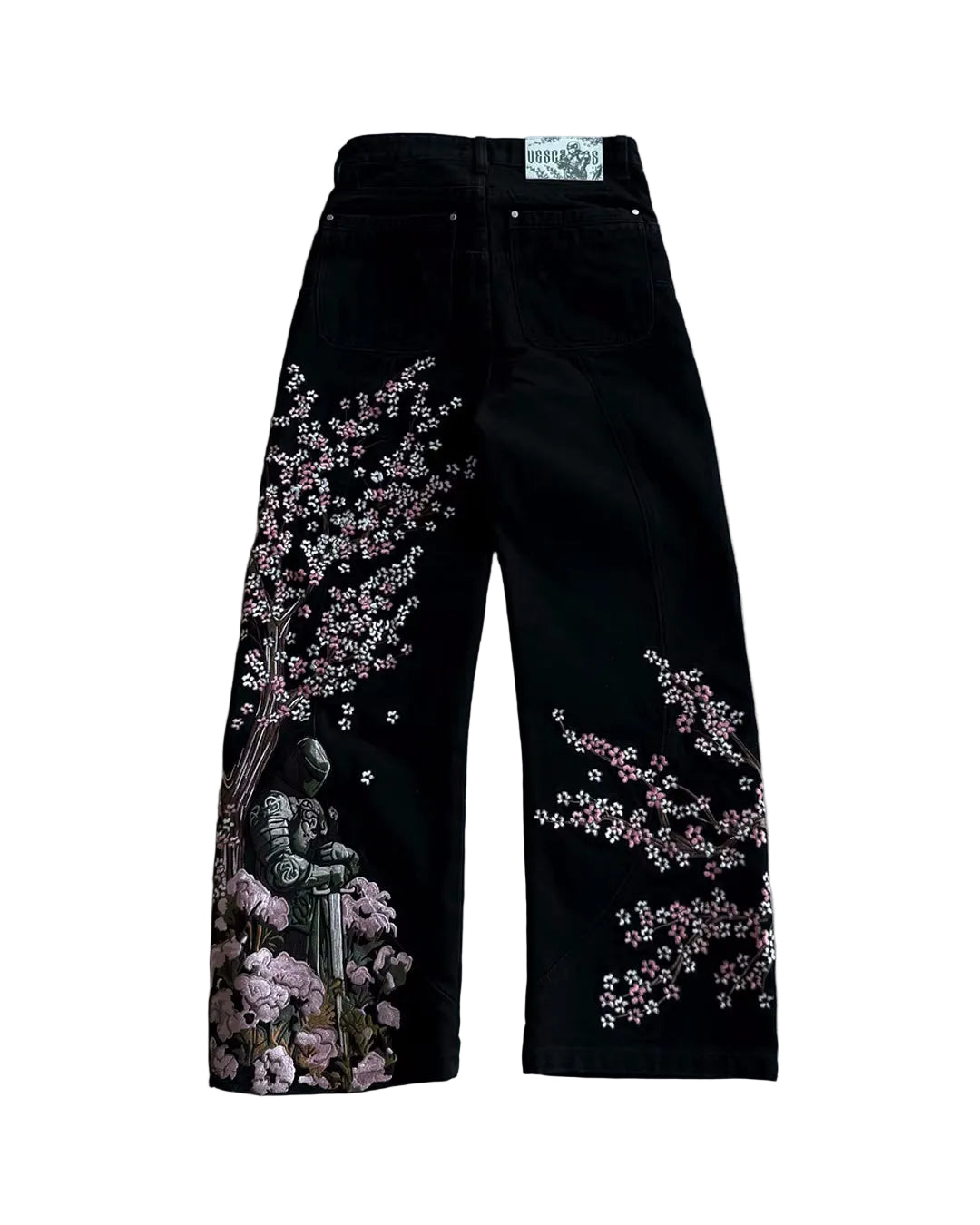 Te czarne jeansy łączą solidny, szeroki krój z wyszukanym, artystycznym wzorem pełnym kontrastów. Wyróżniają się misternym, kolorowym haftem przedstawiającym kwiaty wiśni i figurę rycerza, tworząc niepowtarzalny look łączący streetwear ze sztuką.