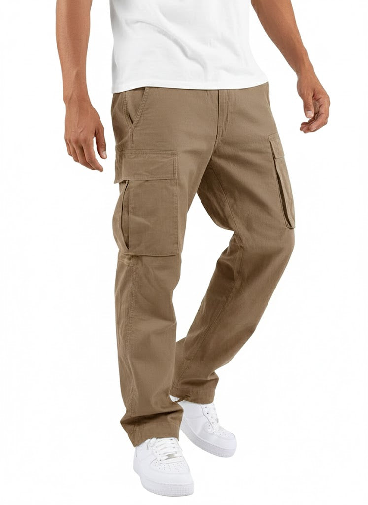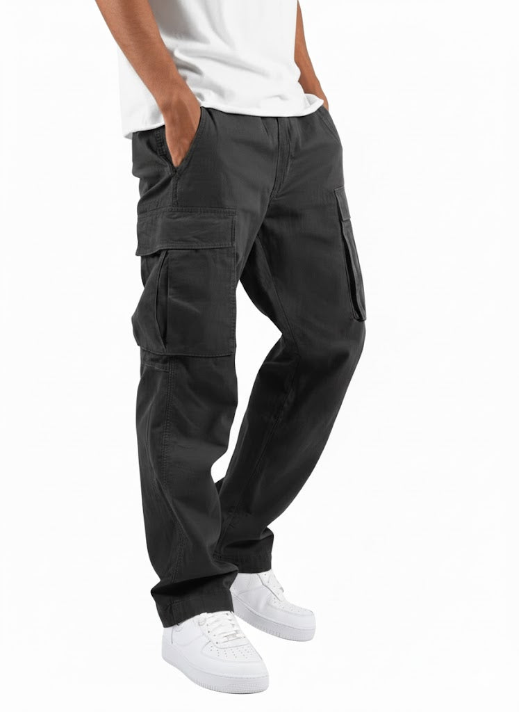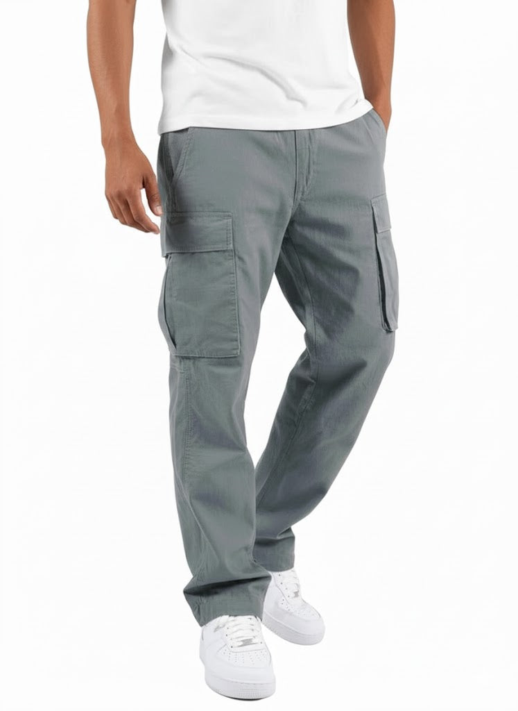 Męskie spodnie cargo mają luźny krój i są wyposażone w boczne kieszenie. Idealne do codziennego noszenia, oferują komfort oraz funkcjonalność.